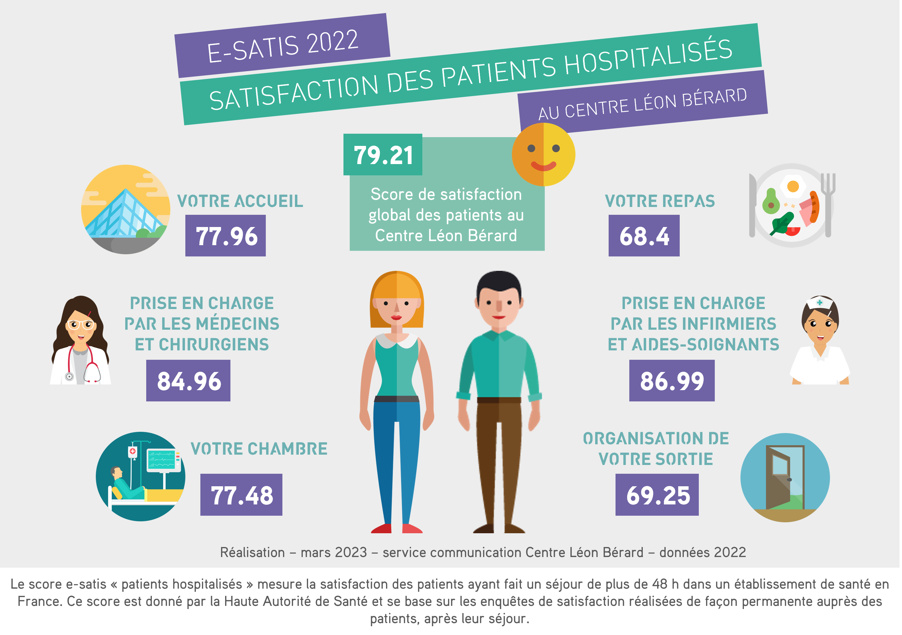 La Haute Autorité de Santé a publié fin 2024 les scores de satisfaction des patients interrogés sur l'ensemble des hôpitaux français. Les réponses des patients permettent de donner une note de satisfaction sur 100 et le Centre Léon Bérard a obtenu cette année la note de 82,5/100 pour les hospitalisations de plus de 48 heures, et celle de 88,5/100 pour les séjours ambulatoires.